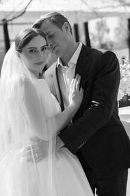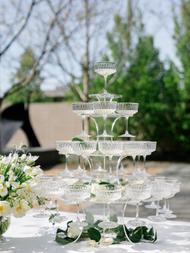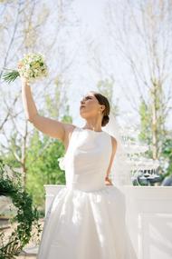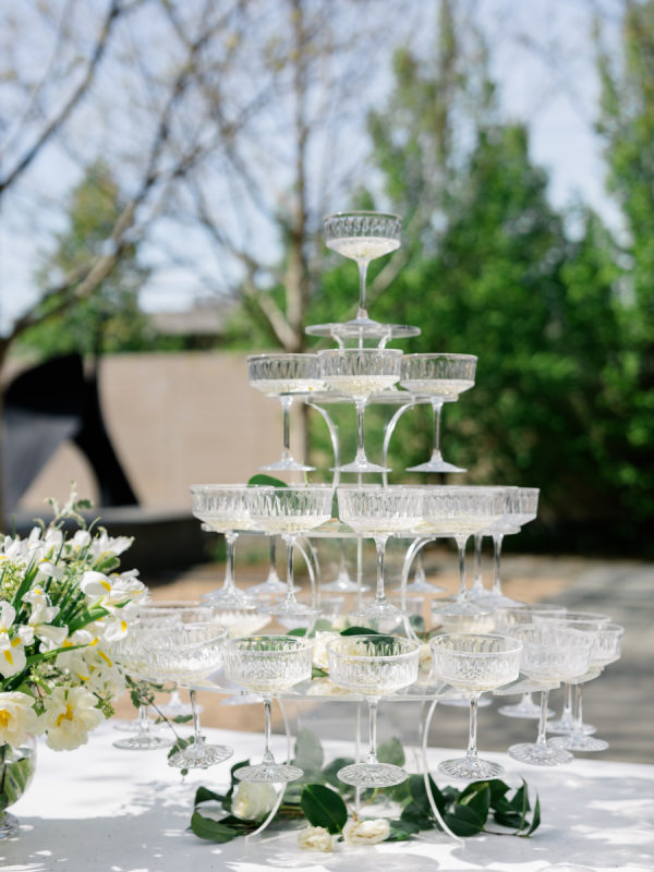 The second bridal look offered a striking contrast in its sleek, sculptural simplicity. A crisp, satin gown with a full skirt and clean neckline brought a modern, almost architectural presence to the editorial. Paired with a soft veil and worn under the dappled light near the champagne tower, the look was both classic and editorial—highlighting the refined sophistication of the overall vision. Together, the gowns told a story of contrast and cohesion: where old-world romance met clean, contemporary lines.[/field]