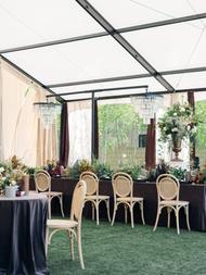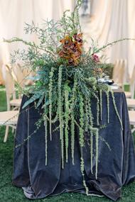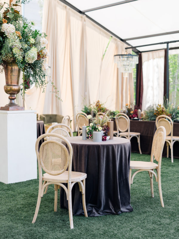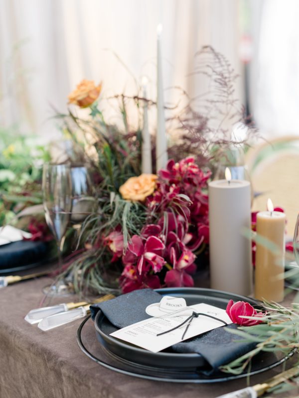 The tablescape was a true fusion of wild elegance and intentional design. Smoky glassware, deep charcoal plates, and rich velvet linens grounded the look, while the florals brought in movement and organic texture. Each arrangement was an artful mix of wispy greenery, blooming stems, and foraged elements that felt like they were plucked straight from a Montana hillside. The palette was earthy with moody undertones—layered without being overwhelming. Every detail was curated to feel elevated but effortless, like nature itself styled the table.