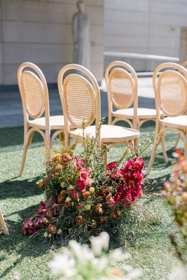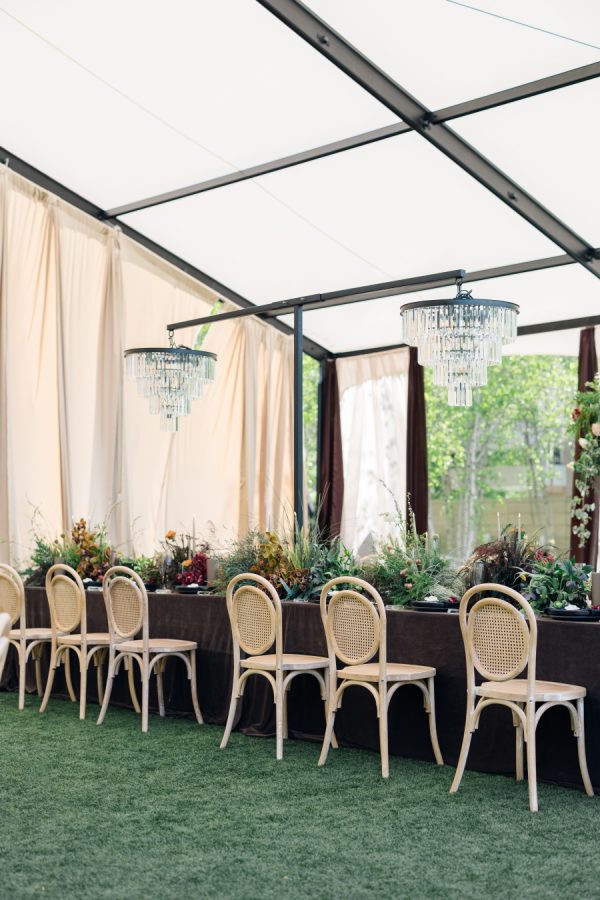 The Columbus Museum of Art in Ohio served as an unexpected yet stunning canvas for this editorial. The shoot took place in the museum’s outdoor courtyard—a private, artful space surrounded by architectural lines and lush greenery. A custom tent was brought in to frame the vision: a curated blend of natural textures, sculptural florals, and elevated tablescape design. The result was a seamless fusion of editorial sophistication and the untamed romance inspired by Montana’s landscape, all within a modern museum setting.